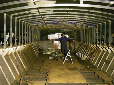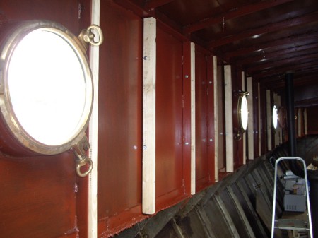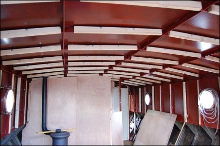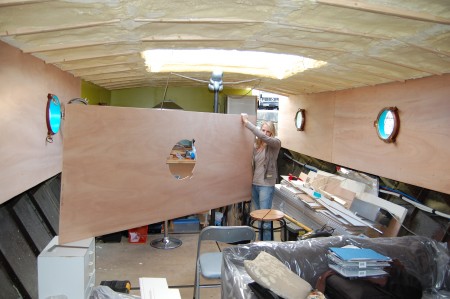 Octobre 2009 : pose du vaigrage en CP CTBX 8mm, vissé sur les tasseaux des "murs". Le positionnement de la découpe des hublots au gabarit est très compliqué, rien n'est droit sur ce bateau banané...