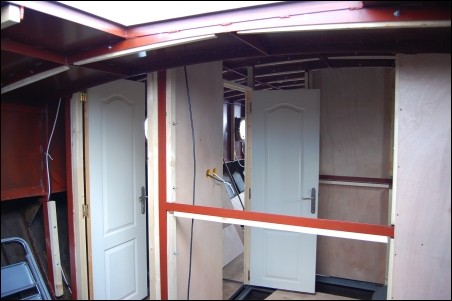 Pour la pose des cloisons, des cornières de 50x50 sont percées puis soudées, formant une structure comme une cage autour de la salle de bain. 2 portes sont installées à l'aide de tasseaux et boulonnées sur la structure. Il a fallu malgré tout réduire la
