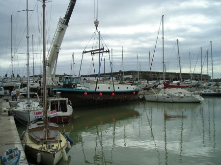 Vendredi 24 juillet, à l'aide d'une grue de 100 tonnes avec tous ces attributs (lest 35T, écarteurs, ...), notre bateau touche à nouveau après plus d'un an au sec.