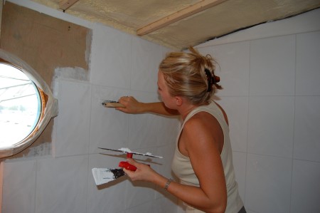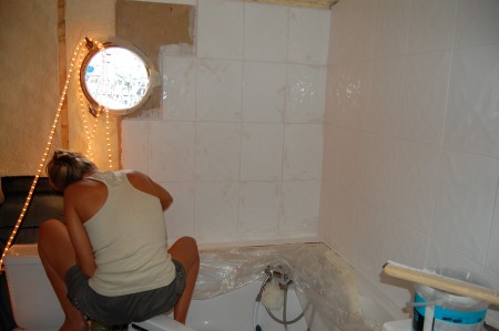 Marjolaine est maintenant "carreleur" dans la salle de bain. La découpe des carreaux à la carrelette n'a pas été un franc succès, nous avons consommé 7m² pour en carreler 3...