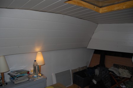 Les cloisons en CP sont peintes, et celle séparant la chambre du compartiment avant est isolée par 10cm de laine de roche.