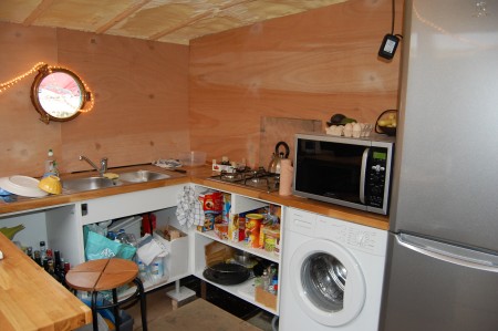 Pose des meubles de cuisine "comme à la maison". Quel bonheur d'avoir un frigo "géant" et une cuisine conviviale.
