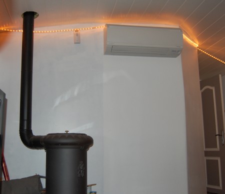 Poêle à bois Invicta de 9KW et pompe à chaleur inverter réversible Daikin assurent le confort en chaud et en froid.