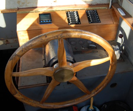 La barre à roue d'origine cohabite avec un afficheur digital Loch/Speedo/Sondeur et un tableau électrique des élements de navigation.