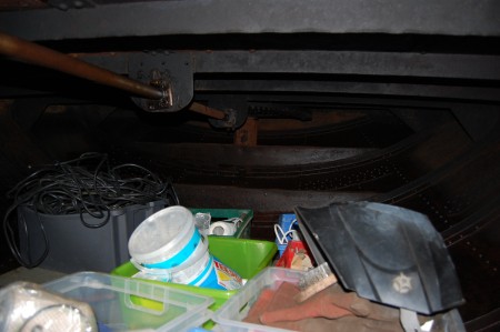 Les tôles des fonds et des bordés du compartiment moteur ont été nettoyées puis protégées par l'application d'une huile épaisse. Un plancher en agglo nous permet de stocker des bacs de rangement.