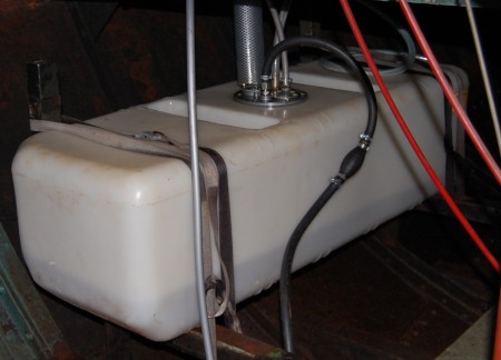 Un plancher en agglo hydro a été ensuite posé, nous permettant d'entreposé des bacs de rangement en plastique . Du coup, quel bonheur de bricoler dans ce compartiment. Réservoir à carburant en tôle sorti, remplacé par un réservoir en plastique VETUS de 140L.