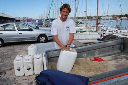J'ai constaté 1,3mm d'enfoncement de l'avant. Glups !!! Après plusieurs semaines de réflexion (plomb, chutes de métal, rails de train, ...), j'ai tout simplement récupéré des bidons en plastique de 20L, que nous avons rempli de sable. Et c'est 2,5 tonnes de lest pas cher, très propre et facile à manipuler qui ont