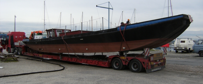 15 jours après la folie de la Queen's Day, notre bateau est grutté sur un camion pour son rapatriement à Bordeaux.