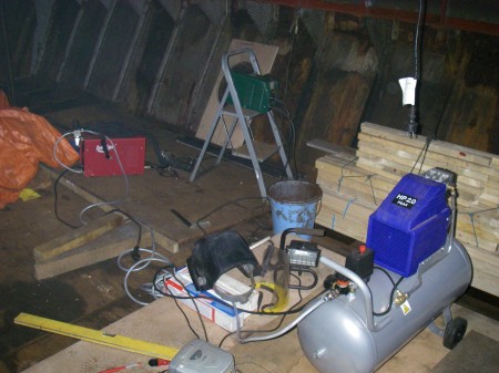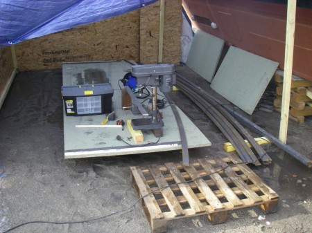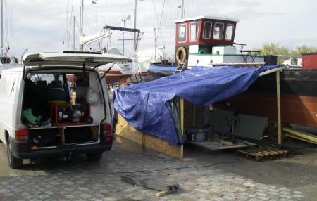 Afin de travailler au sec, le premier boulot consiste à construire un abri à coté du bateau. Mon VW Transporter est transformé en camion-atelier, avec groupe électrogène et tout l'outillage pour travailler le métal.