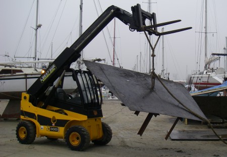 par les picotements des étincelles malgré une protection intégrale du corps et du visage. Je refuse de découper encore des petits morceaux et je mets en place une solution radicale. Je soude une cadène au milieu du morceau de pont à enlever, et à l'aide d'un gros chariot élévateur que je loue à coté, je lève en une seule fois une tôle de 800Kg, mesurant 2m50 par 3m50.