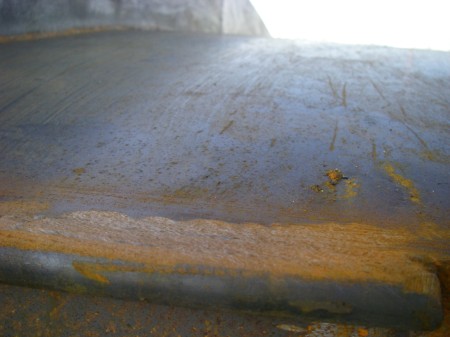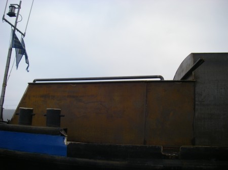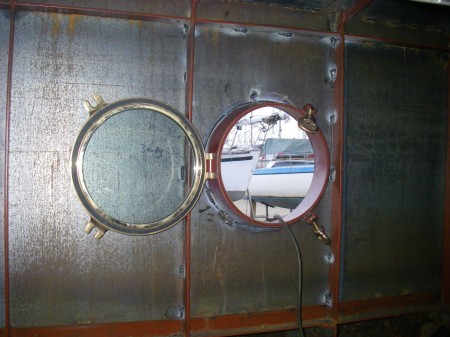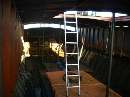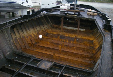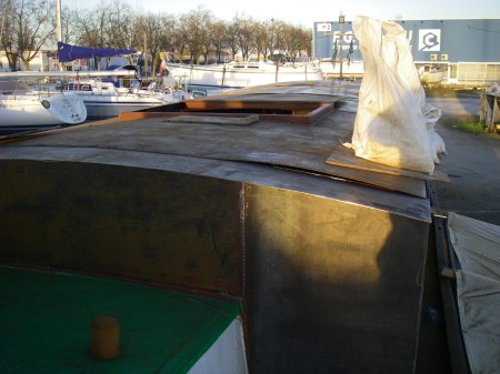Pour une coque en 6mm à l'origine, on peut juger ce bateau en excellent état. Aucun rivet n'est à couronner. Seul une infiltration dans la liaison coque/pont a permis à la rouille d'attaquer certaines parties hautes du bordé.