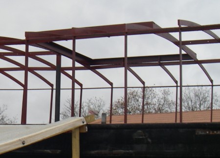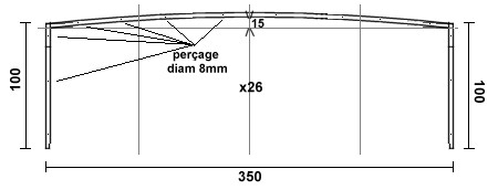 40 barres de 6m de long sont achetées au fournisseur de métal du coin. Je les découpe en 1m/1m/4m, et apporte les sections de 4m chez un chaudronnier qui me les cintrera avec une flèche de 15cm.