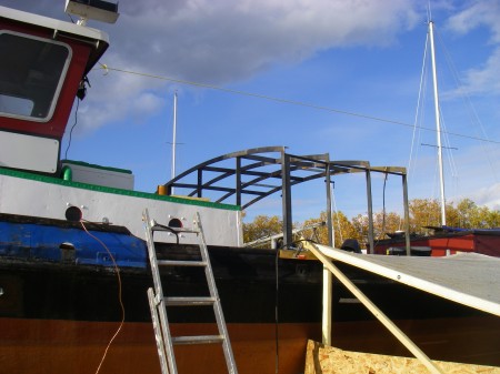 La grue, louée pour 4h, nous permettra de remettre en place la lourde marquise. Cette timonerie, construite toute en acier pèse plus de 500Kg. Elle n'est pas repliable, j'espère que le tirant d'air n'excède pas les 3m40 afin de pouvoir passer sous les ponts les plus bas du canal du midi.