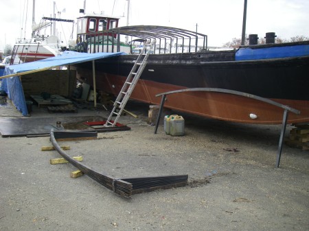 professionnelle du bateau. Le fer plat ne repose pas sur toute sa longueur, et il faut le couper en segment de 2 à 3m afin de conserver la courbure longitudinale du pont.