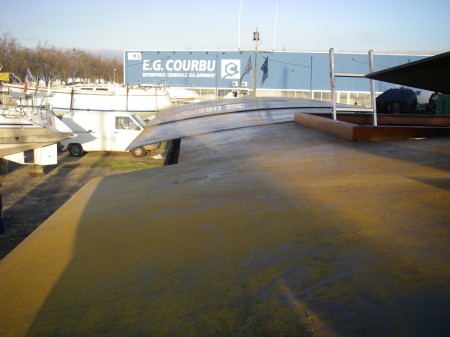 Une doublante dans les fonds a été réalisé récemment, la qualité du travail est excellente. La moyenne des épaisseurs de la coque est de 5.7mm, avec un point à 4.1mm qui sera doublée à ma demande car un impact a fragilisé la zone.