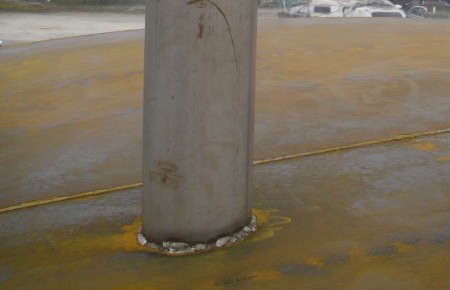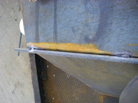 La saleté s'est accumulée sous la cornière rivetée qui assure cette liaison, et l'eau qui stagne a fini de perforer quelques zones.