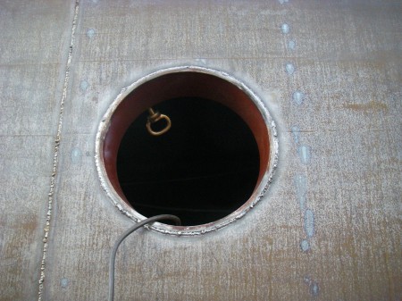 Ces points ont été choisis à l'aide d'un relevé des emplacements des doublantes et des membrures, et à l'oreille à l'aide d'un gros marteau. Il faut un peu d'expérience pour entendre à l'oreille les zones qui paraissent un peu faible.