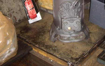 Une table à membrure de 4m par 1m50 est construite en bois dans l'abri. Des cales sont disposées aux angles, et des découpes permettent la soudure des liaisons montants/barreaux.