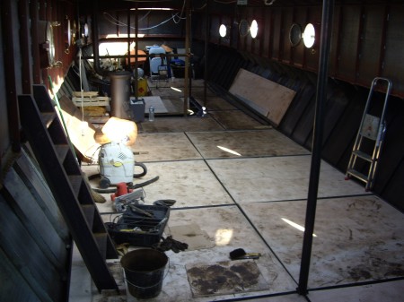 Ca y est, notre bateau est à coeur ouvert, c'est maintenant une grosse piscine de 50m²...