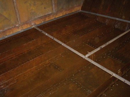 Une bonne connaissance des coques en acier permet aussi de savoir où se trouvent généralement les zones les plus menacées. Les fonds étant très gras, ils sont dans un état proche du neuf malgré les presque 100 ans du bateau.