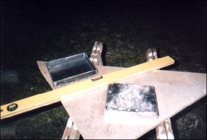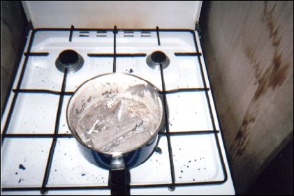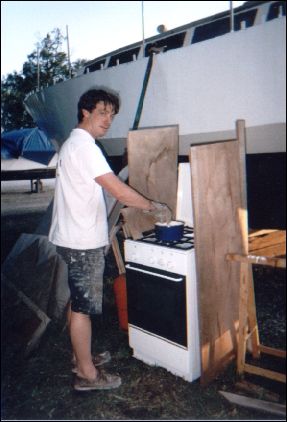 2900 kilos à placer dans les fonds. Plusieurs solutions sont alors possibles : fonte, plomb, chutes d'acier. Le béton est à exclure, bien trop léger (densité 3, alors que le plomb c'est 11 et l'acier 8). L'acier, ça ne se travaille pas comme ça et une tôle de 4cm d'épaisseur, j'en fait quoi ? L'idéal serait d'avoir des lingots aux formes des fonds de Quasar. N'ayant pas une usine métallurgique à portée, seul le plomb peut être fondu par un amateur. J'achète alors 500 kilos de plomb chez un ferrailleur (c'est pas donné !!), que je ramène dans la 4L avec la gazinière de Julie et une casserole. Il faut ensuite couper les tuyaux de plombs en morceaux de 10cm maximum de long, puis les mettre dans la casserole sur le feu. Un quart d'heure plus tard, les tuyaux ont disparus au profit d'un liquide épais couleur argenté d'aspect très proche du mercure. Il ne faut surtout pas respirer les vapeurs, le saturnisme en 10 minutes à vite fait de vous faire tourner la tête. |