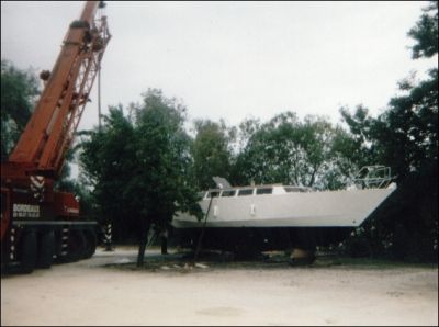 première larme. Je suis vraiment con !! Il me reste quelques trucs à faire, comme mettre un peu de lest (400 kilos de lingots de plomb), mettre l'hélice et les anodes d'arbre, ranger le bateau. A 8 heures 30, lorsque l'énorme grue de 80 tonnes de capacité arrive, je suis prêt. On commence par la vedette en bois de Jean-Jacques. Le sol est trop meuble, on est obligé de placer des plaques d'acier sous les béquilles de la grue. C'est long. Le bateau en bois craque un peu, s'envole puis se pose sur l'eau sans problème. Première mise à l'eau réussi. C'est enfin à mon tour. Il y a du public...J'ai pas le temps d'avoir le trac, je cours partout... La grue se positionne, les sangles sont passées, et Quasar s'envole de son ber. Il faut le passer par dessus les arbres, à plus de 15 mètres de haut. Le gruttier ne veut pas que je reste dessus. Philippe, le propriétaire du Burdigala, un bateau de promenade fluvial, à l'aide de son autre bateau (Evolution, un bateau taxi très puissant et très maniable) m'amène sur Quasar que je vois toucher l'eau juste devant moi. A l'aide d'un bout de remorquage, et face au courant, il place Quasar à son emplacement tout en douceur. Ca y est Quasar est à quai, sur l'eau. Je vérifie à nouveau toutes les entrées d'eau, tout est OK. Seuls deux points sont à surveiller. Le passe coque et la vanne de prise d'eau moteur et le soufflet du joint tournant de l'arbre d'hélice. Si ce soufflet bouge, le bateau coule...Glupps... Je dissimule plutôt bien mes larmes de joies, personne ne voit rien, mais je pense que c'est une des plus fortes émotions que j'ai ressenti dans ma vie. Quasar a lui aussi le sourire de revoir enfin son milieu naturel... |