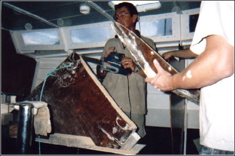 d'oeuvre arrive pour mettre la dérive dans le bateau, il est 16 heures. La dérive est vite sur le pont, elle pèse un peu moins de 150 kilos et a quatre, c'est un jeu d'enfant