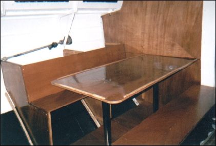 Dimanche 7 avril, les cloisons du carré sont coupées, vernis et prêtes à être définitivement posées. Elles sont boulonnées contre les membrures et prises en sandwich par un tasseau de 20X35 de chaque coté.