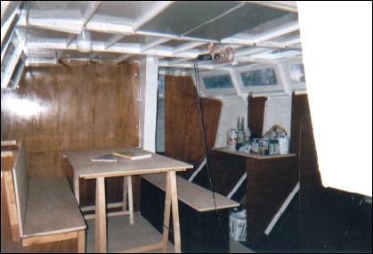 avec apport de matière, c'est vraiment une fusion de deux pièces qui après n'en font qu'une. La solidité et la longévité du matériau est vraiment rassurante. Je commence maintenant à meubler. Mais c'est pas du Ikea prêt à poser qu'il me faut. Tout doit être fait sur mesure, en respectant quelques règles : Les aménagements doivent être simple, robuste, facilement démontable pour accèder à la coque, bien conçu pour permettre une parfaite isolation du métal. En effet, à cause de la condensation et de l'effet de zone froide, aucun centimètre carré de métal ne doit être au contact de l'air de l'intérieur de la coque. Tout doit être isolé avec de la mousse encastré dans la structure de la coque. C'est rigoureusement obligatoire pour le pont et les hiloires, moins pour les bordés, et déconseillé pour la partie sous la flottaison. En effet, la mer sert de régulateur de température de l'intérieur de la coque. La moindre partie métallique non isolée se transformera inévitablement en fontaine au petit matin, avec surement quelques gouttes dans le lit, la nourriture ou la table à cartes... Cette semaine de début avril, je pose les premières cloisons, en contre plaqué de 12 à 18 mm, vissées dans des tasseaux eux mêmes boulonnés à la structure. J'ai acheté du polistyrène expansé (le blanc, avec les boules qui se mettent partout) dans un magasin de fournitures pour le batiment, et j'ai commencé à poser quelques plaques. Un doute m'a soudain assailli. Comment se comporte cet isolant face au feu. J'ai mis un petit morceau de polistyrène sur la flamme du briquet. Il s'est enflammé immédiatement, et rapidement, en dégageant une épaisse fumée noire. J'ai immédiatement tout sorti du bateau, et j'ai ramené ces plaques dangeureuses au magasin. Je les ai remplacé pas du polistyrène extrudé, de couleur verte ou bleu, beaucoup plus dense, mais surtout classé M1, c'est à dire résistant au feu, et non combustible. J'ai appris par la suite que l'expansé est classé M4, c'est à dire inflammable et dégageant du cyanure lors de la combustion... Tant pis si c'est quatre fois plus cher, j'ai pas trop envie de faire la merguez au milieu de l'atlantique... |